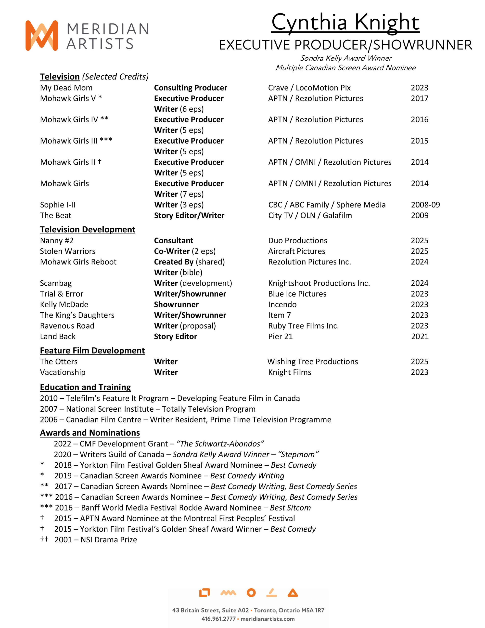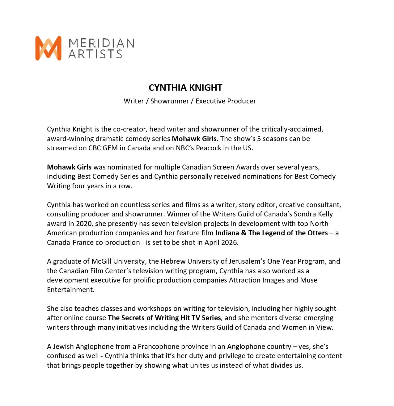 Co-creator and showrunner of the critically-acclaimed, award-winning series Mohawk Girls, Cynthia has worked as a writer, story editor and creative consultant on TV series and feature films, was a development executive for many years, she coaches writers and actors, and teaches TV writing to young whippersnappers she hopes will hire her one day.